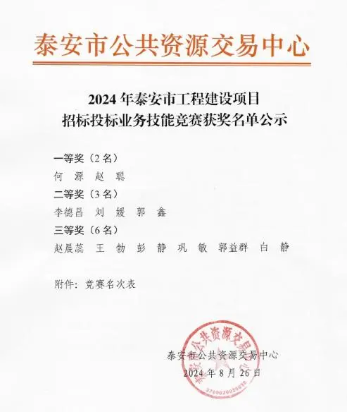 8月26日,2024年泰安市工程建设项目招标投标业务技能竞赛在泰安市公共资源交易中心成功举办。来自泰安各县市区分中心组成的5支代表队共11名选手参加竞赛。