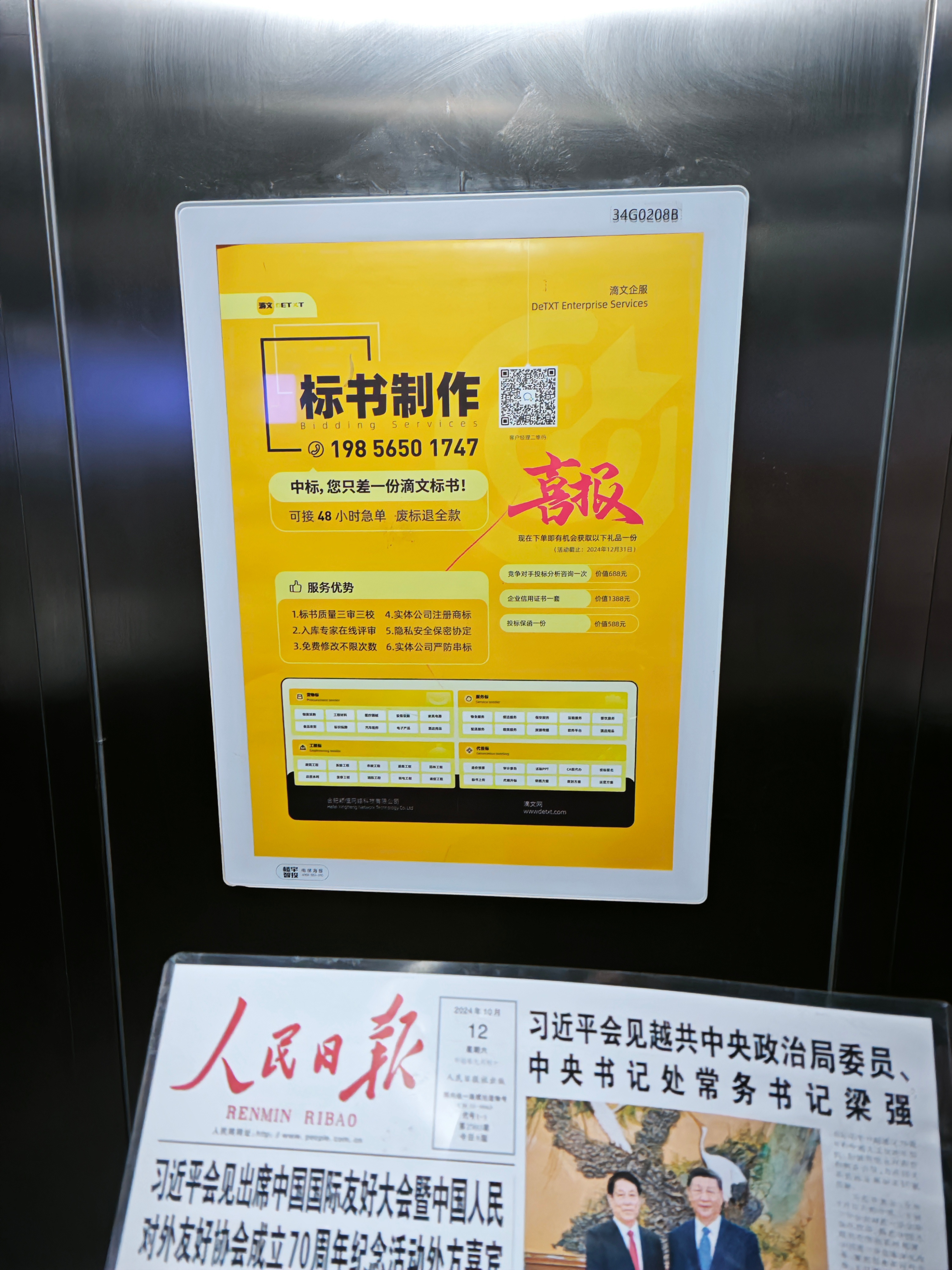 滴文标书代写公司,作为一家在标书代写领域拥有丰富经验和专业能力的企业,目前已经在合肥地区的多个主要商业超市及购物中心的电梯内,隆重启动了其精心策划的电梯广告宣传活动。包括:安徽科技大厦、诚挚大厦、肥西交通违法处理中心、丰辉国际广场、国轩凯旋大厦、海通大厦、海王大厦、宏图大厦、华尔街、华商广场、吉瑞泰盛、九珑湾商业、南翔汽车智慧新城、琪瑞大厦、全景大厦、商会大厦、上房大厦、万派广场、新中泰、星海龙御湾、星海世纪广场、烟墩商业街、医药产业园、英华大厦、中辰优唐、中州世纪广场等。